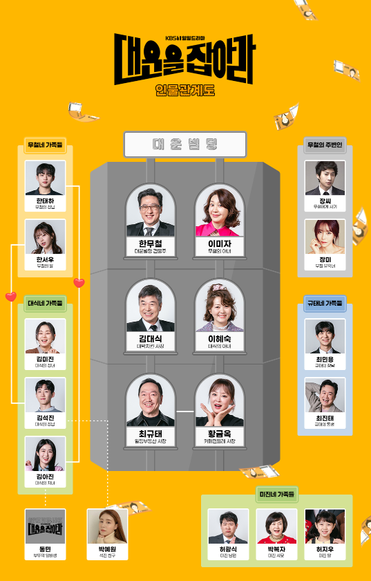 | 손창민 | 한무철 | 대운빌딩 건물주, K-스크루지. 가족보다 돈을 우선시하다 사기를 당해 인생이 뒤바뀐다. |